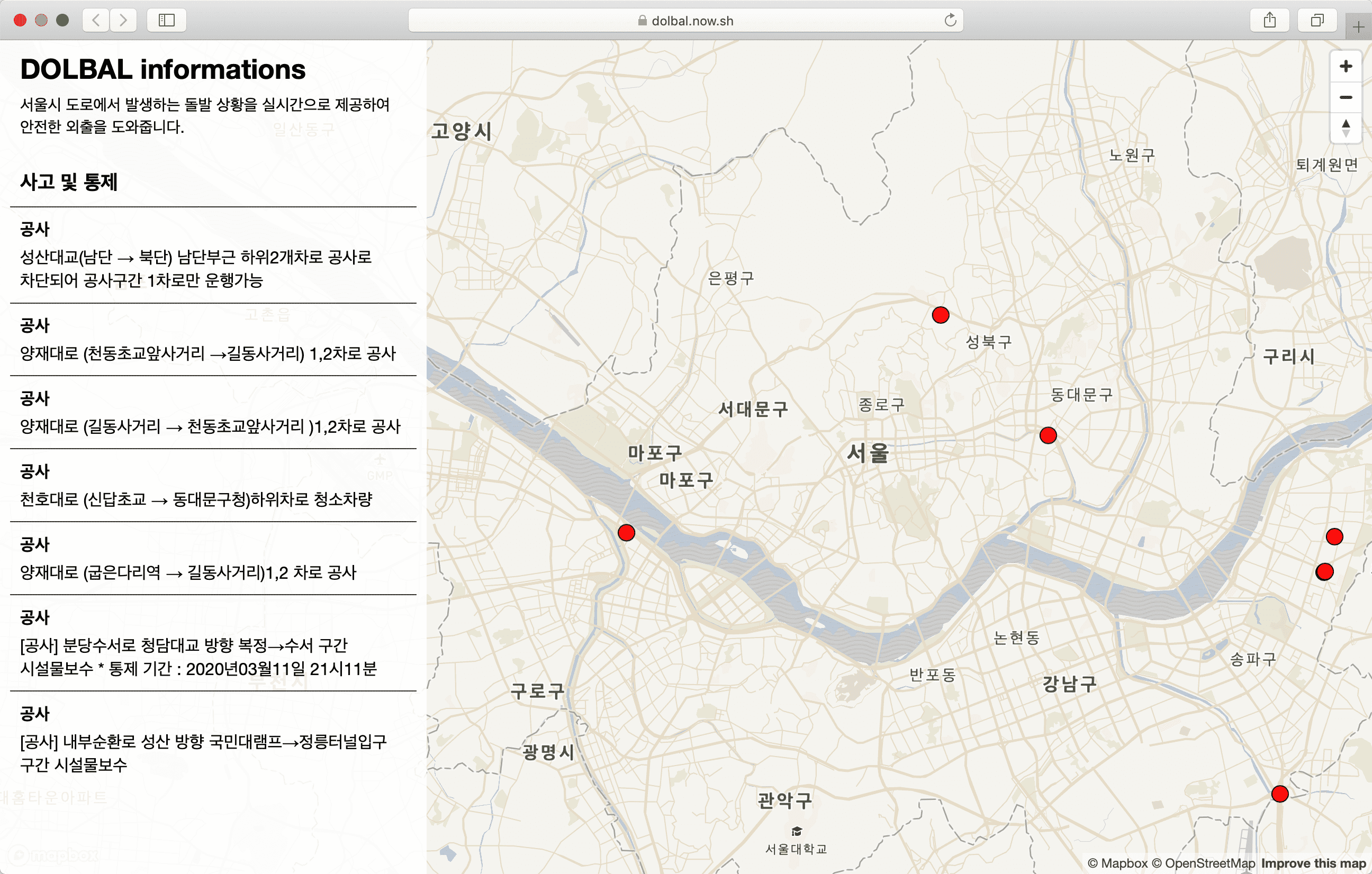 Dolbal은 서울시 도로에서 발생하는 돌발 상황을 실시간으로 제공하여 효율적인 외출 동선을 정하도록 도와주는 사이트입니다. 마커를 클릭하면 상세 돌발 정보를 확인할 수 있으며, 추후 유형별 돌발정보 및 주말에 예정된 집회 정보를 표시할 예정입니다.