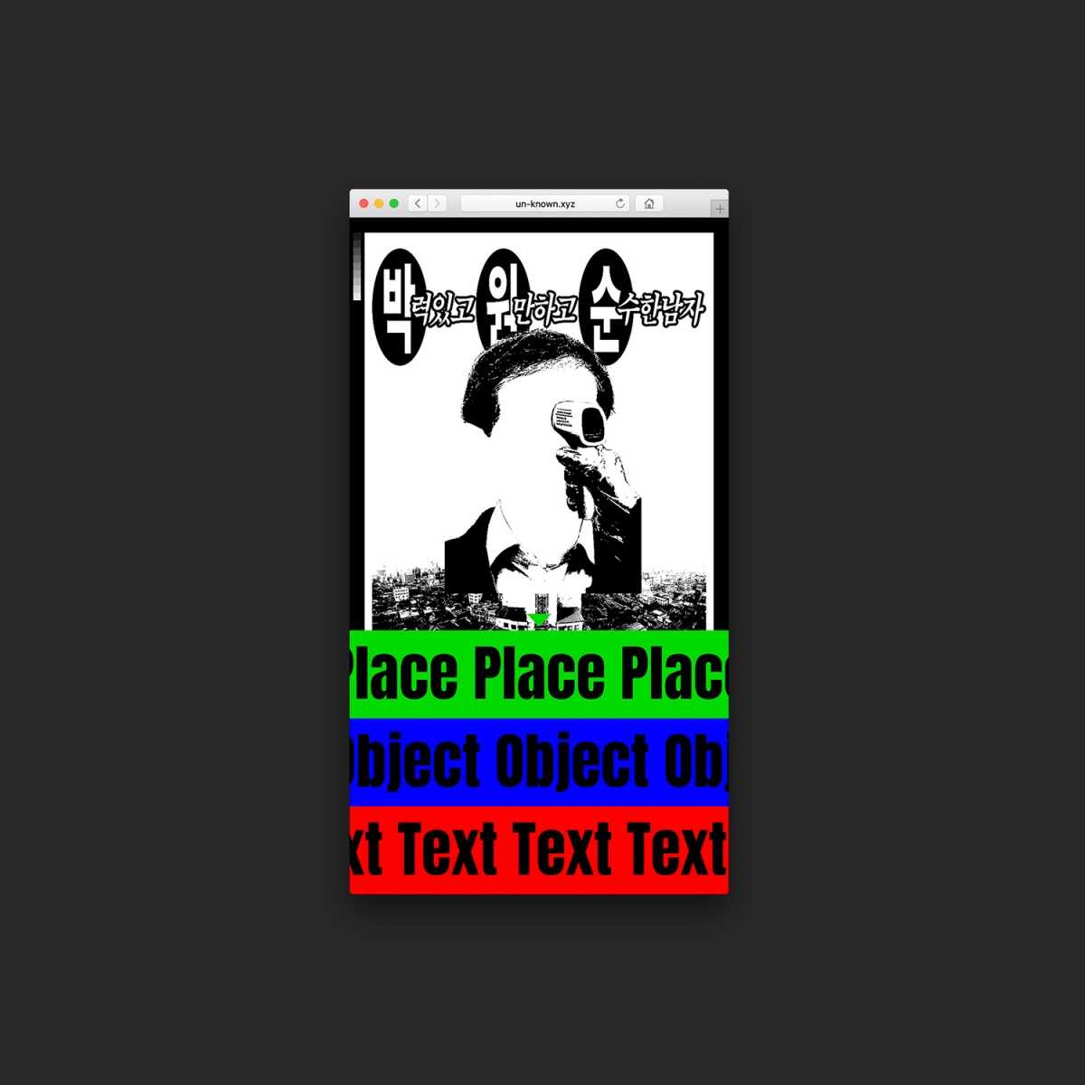 un-known.xyz(미지수)는 제약된 연산 아래에서 미지수에 가까운 작가 박원순의 장소, 사물, 언어를 조합/산출하는 출력 프로그램이다. 프로그램이 작동하는 동안 사용자는 매번 다른 결괏값을 마주하게 되며, 마땅히 이는 변수에 상응한다. 기실 변수와 닮은 산출 값은 2019년 현재, 작가 박원순을 이해하는 저마다의 답이기도 하다.